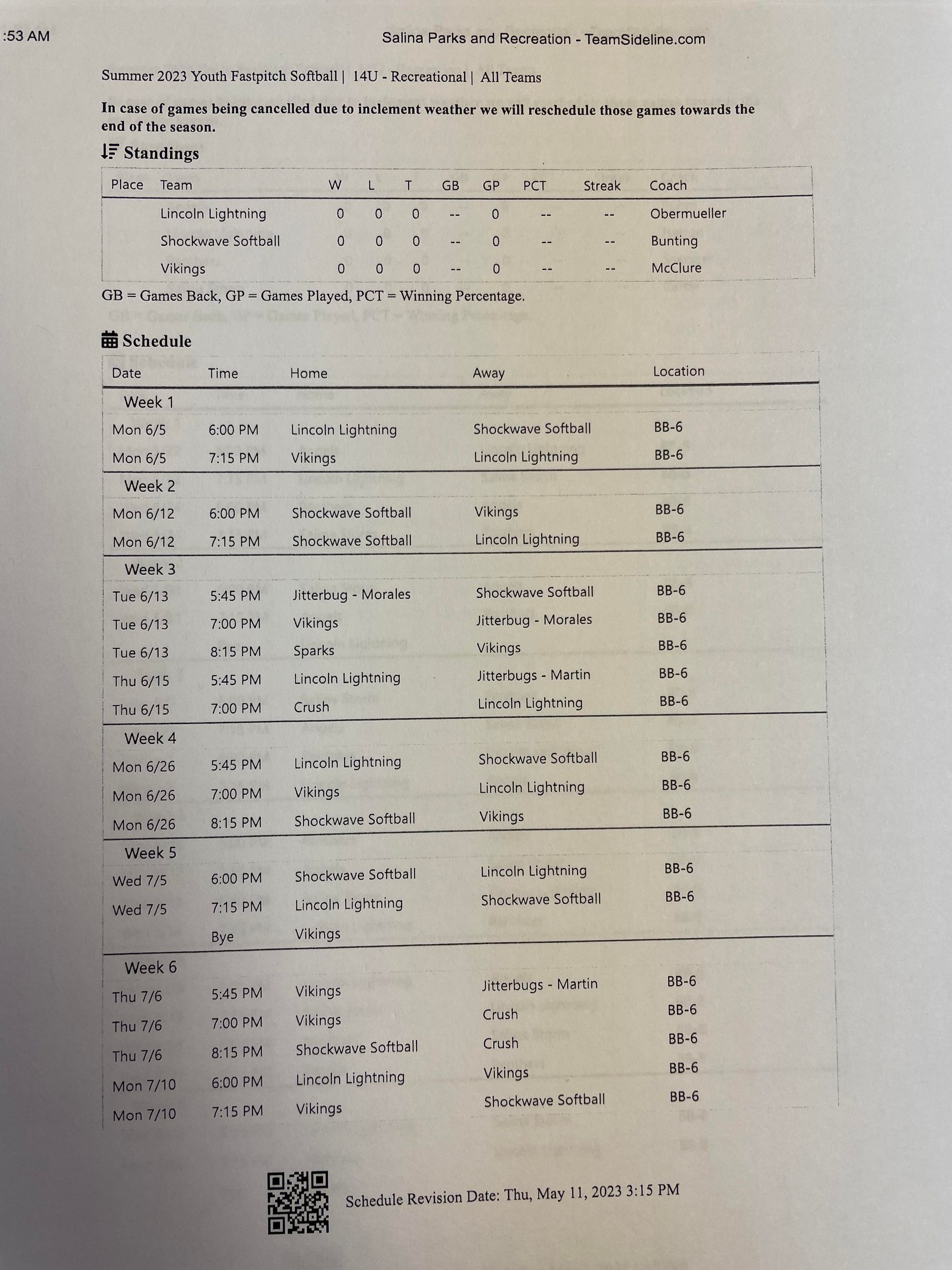 14U softball is for girls 14 years and younger. They practice during the month of May and travel to Salina during the month of June for games. This is a competitive team that works on skills and begins to develop pitching.
